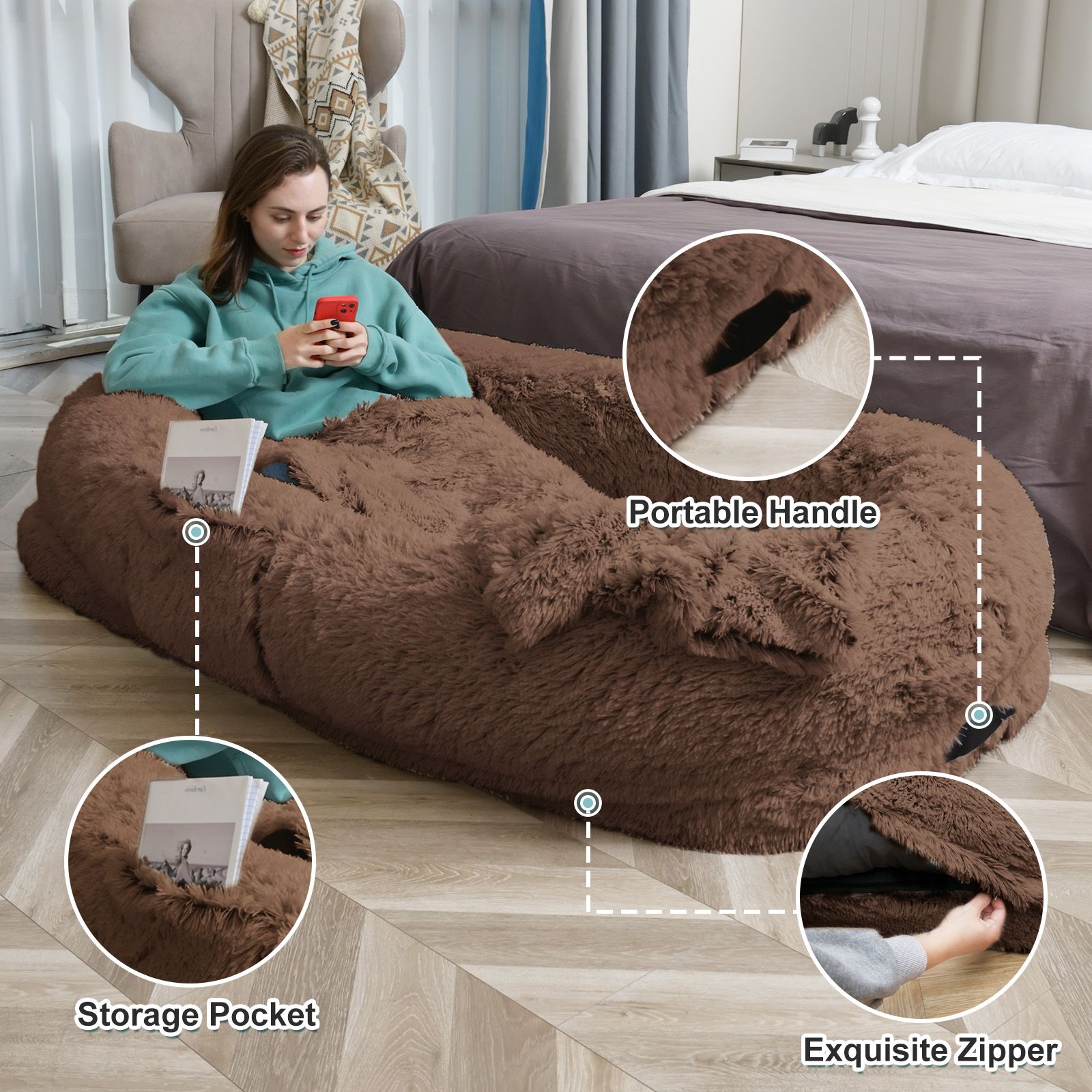CONVENIENT & THOUGHTFUL DESIGN - This human size dog bed includes a storage pocket on the side for you to keep small things in while you rest, and two handles for easy movement. The adult dog bed for humans also comes with a strap, allowing you to store it easily when not in use